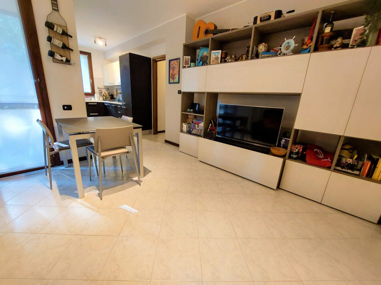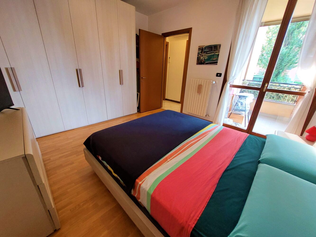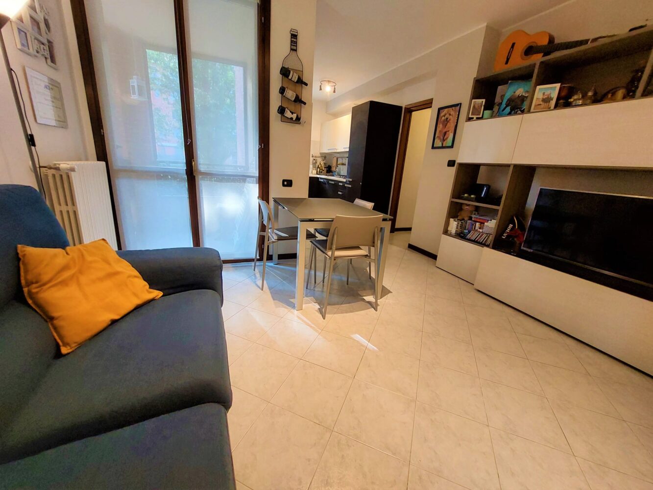 ingresso direttamente sul soggiorno con affaccio sul primo balcone con zanzariere esterne, cucina a vista con doppia finestratura, disimpegno che suddivide la zona giorno dalla zona notte, bagno padronale finestrato con vasca/doccia e camera matrimoniale con affaccio sul secondo balcone.