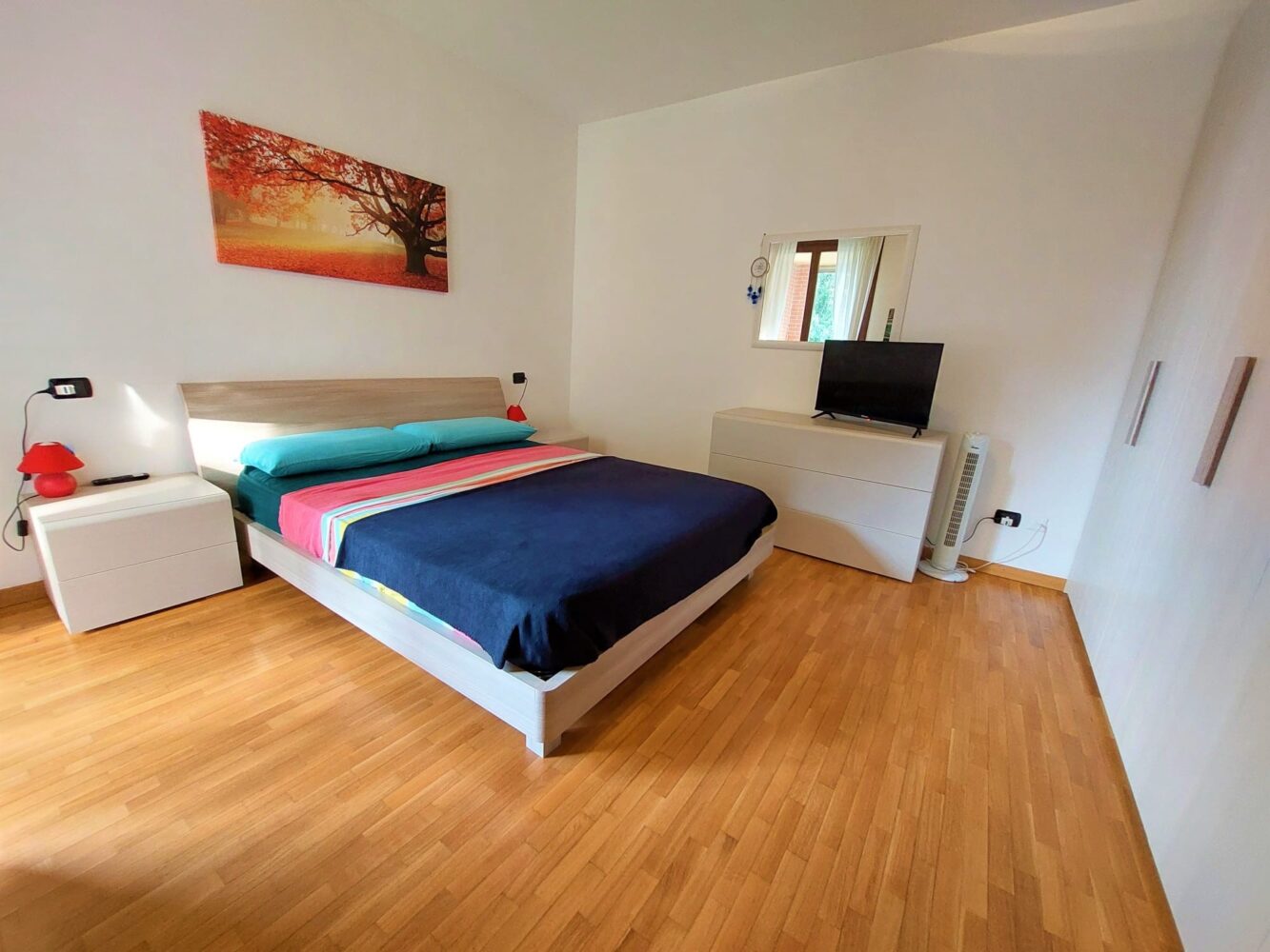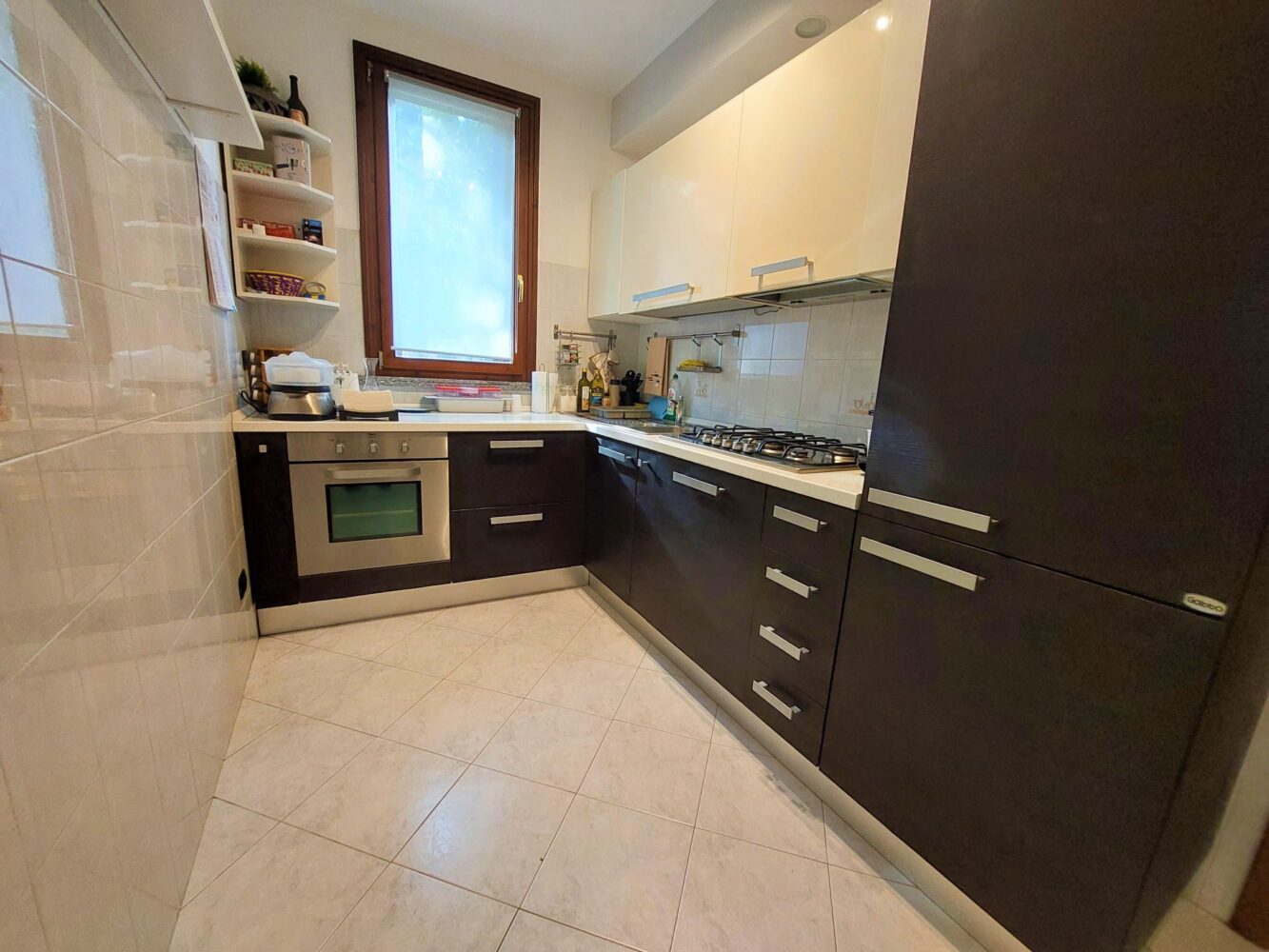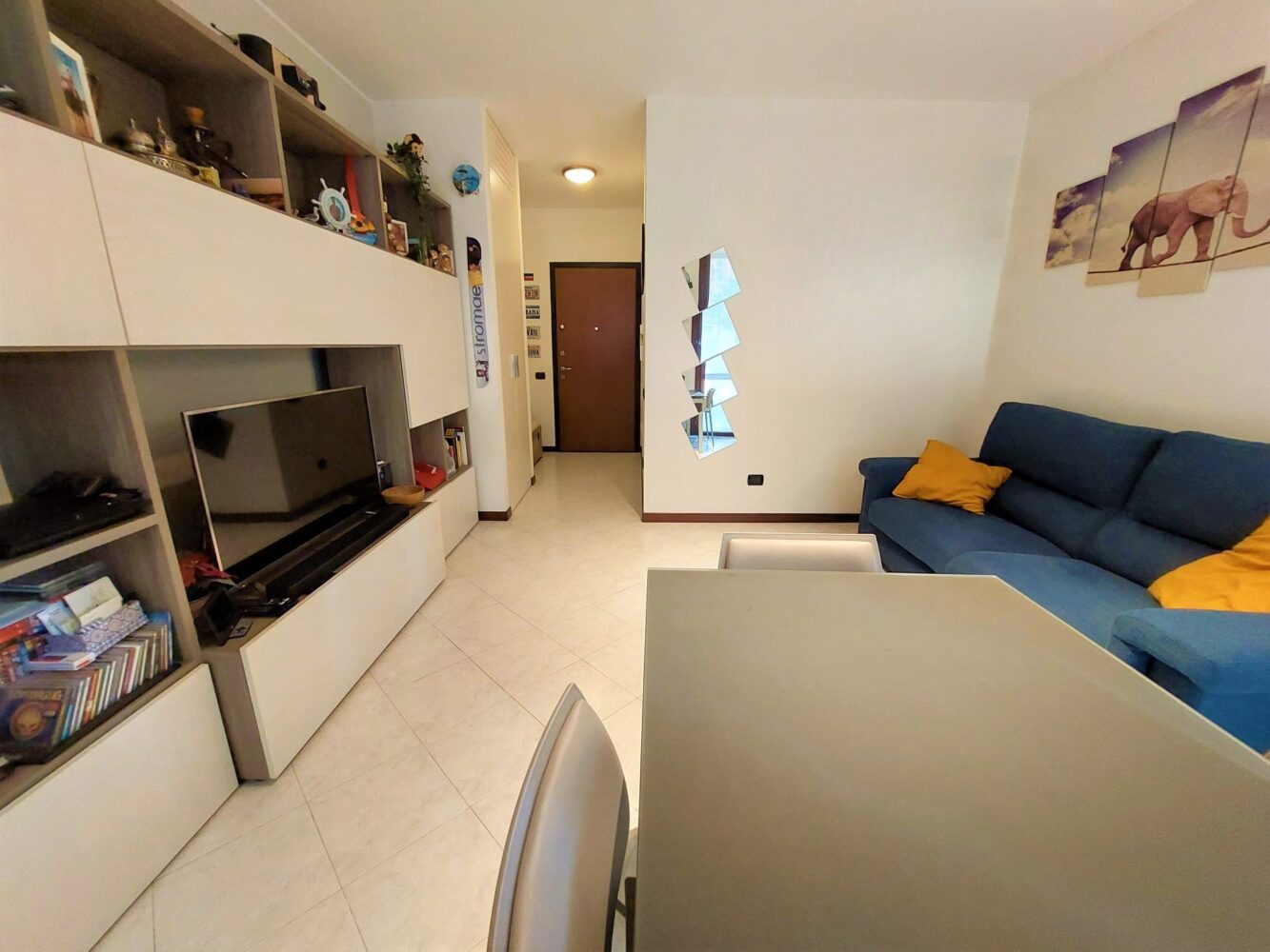 ingresso direttamente sul soggiorno con affaccio sul primo balcone con zanzariere esterne, cucina a vista con doppia finestratura, disimpegno che suddivide la zona giorno dalla zona notte, bagno padronale finestrato con vasca/doccia e camera matrimoniale con affaccio sul secondo balcone.
