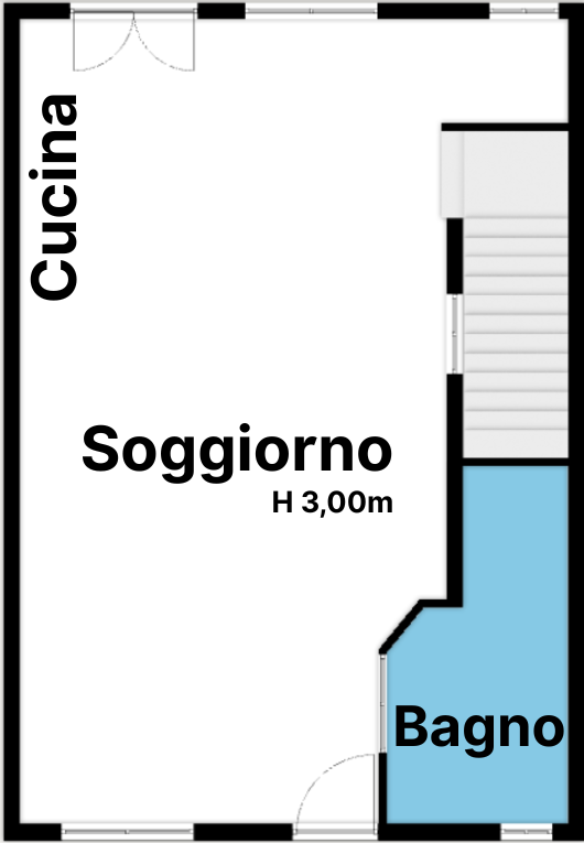 Al piano terra troviamo un’ampia zona giorno con cucina a vista, arricchita da una stufa a pellet, e un bagno finestrato con doccia.